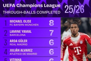 本赛季欧冠成功直塞传球榜:奥利塞8次居首,亚马尔7次第二